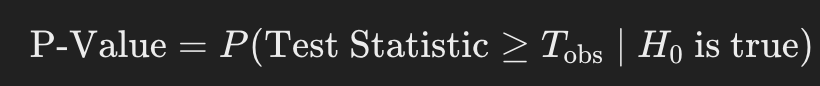 P-Value는 귀무 가설이 참이라고 가정했을 때, 우리가 관찰한 통계량(또는 그보다 더 극단적인 통계량)이 나올 확률임.